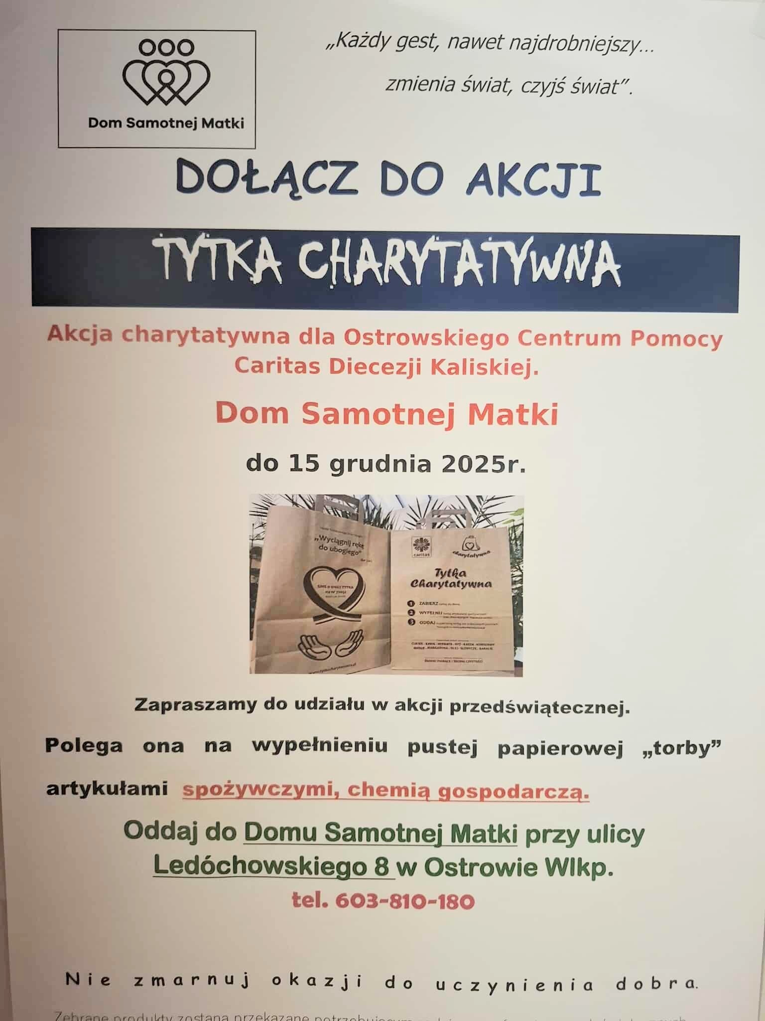 Tytka Charytatywna to inicjatywa, która polega na zbieraniu darów w papierowych torbach, które następnie są przekazywane osobom potrzebującym. Tytki są wypełniane przez darczyńców produktami spożywczymi, środkami czystości oraz innymi artykułami pierwszej potrzeby o długim terminie ważności. Następnie są one przekazywane do lokalnych punktów Caritas, skąd trafiają do osób w trudnej sytuacji życiowej. To dla nas ogromna radość widzieć tak wielkie zaangażowanie i dobroć.
