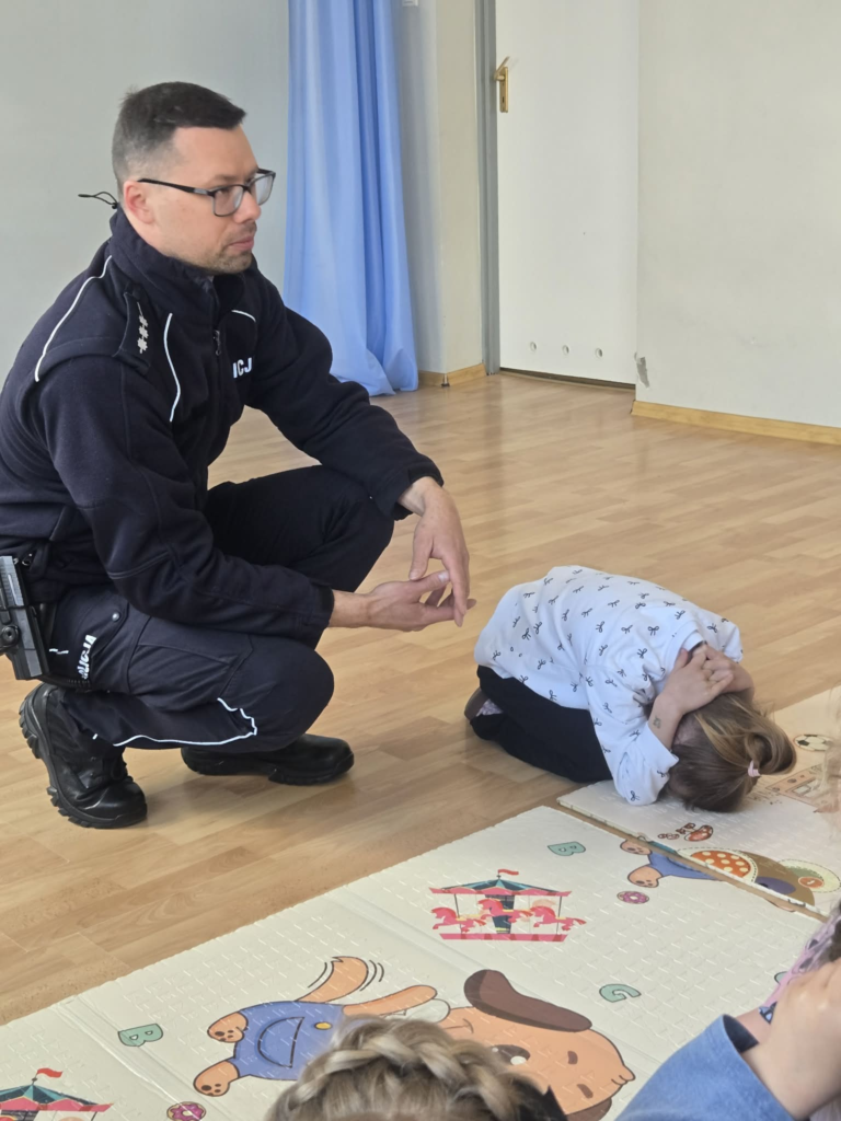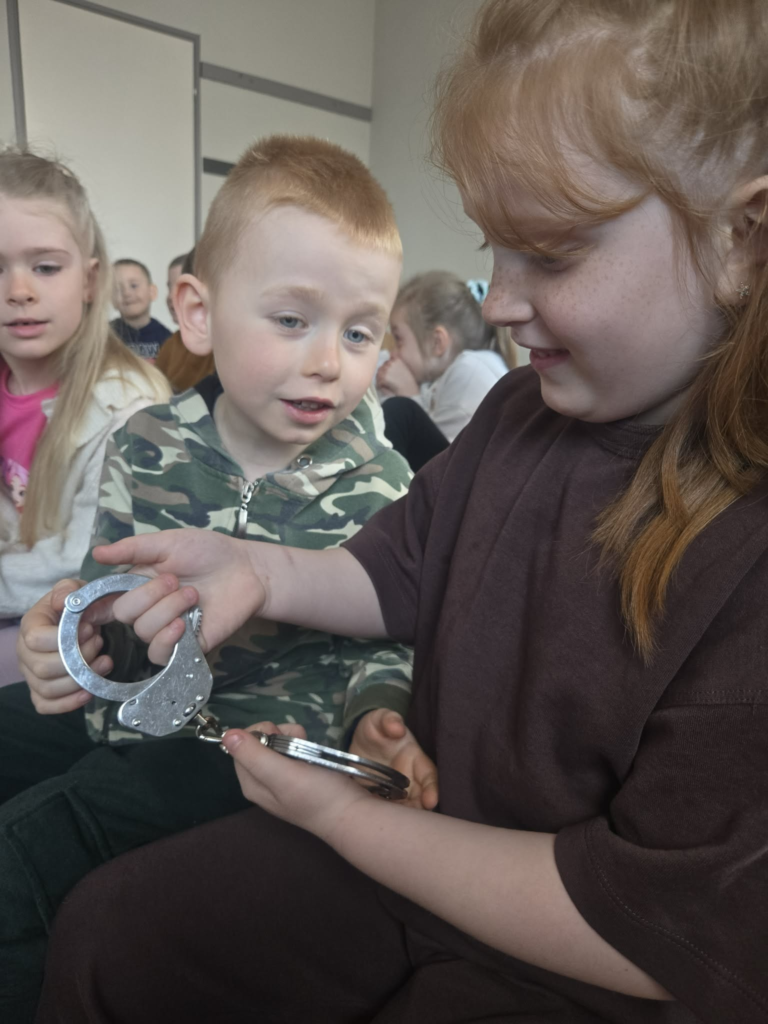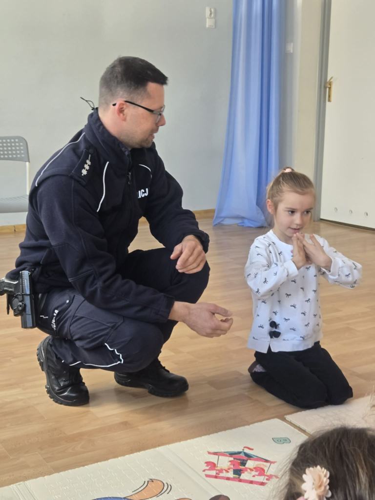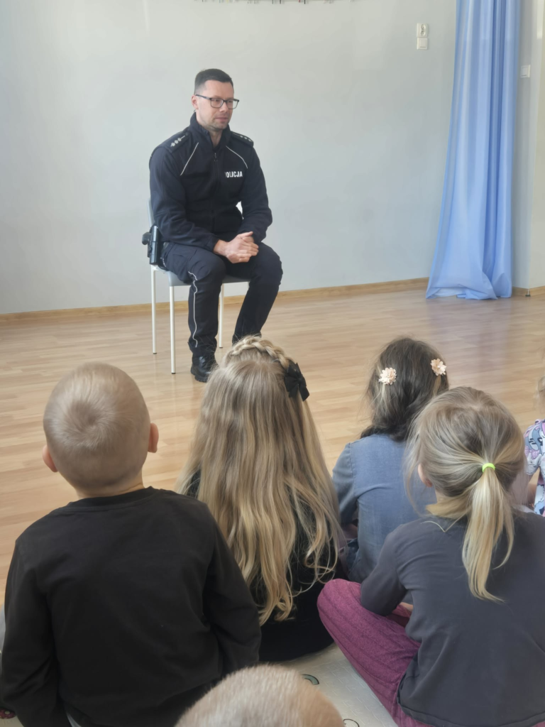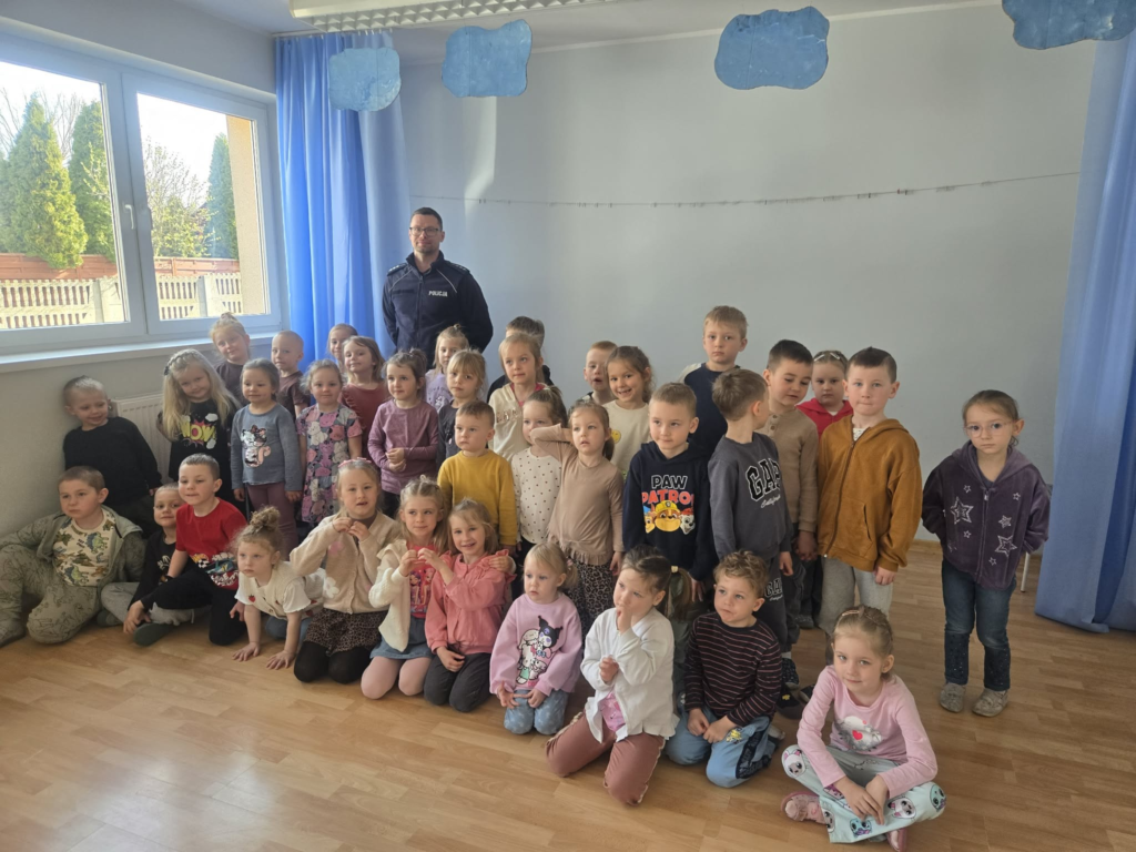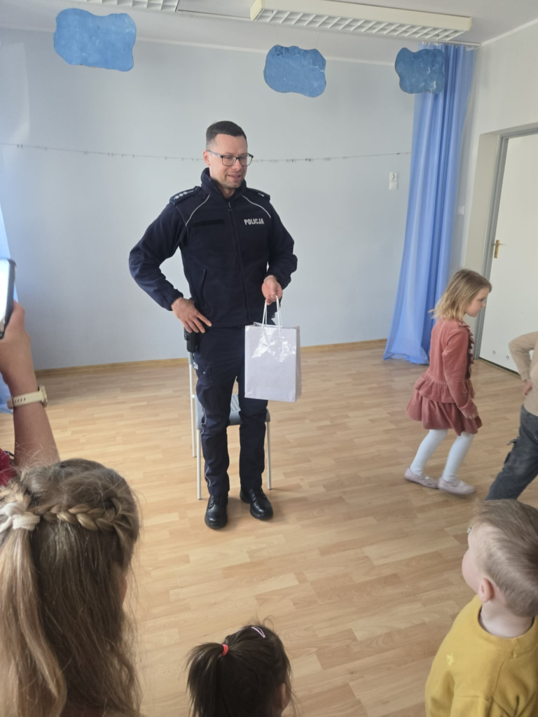We wtorek w naszym przedszkolu odbyło się spotkanie z policjantem. Tematem spotkania było utrwalenie z dziećmi zasad ruchu drogowego oraz przypomnienie zagadnień dotyczących bezpieczeństwa dzieci w przedszkolu i w domu. Pan policjant, w formie praktycznej przypomniał podstawowe zasady zachowania się podczas przejścia przez jezdnię. Następnie wytłumaczył jak należy zachowywać się w kontaktach z obcymi ludźmi, jak dbać o bezpieczeństwo własne i innych oraz do kogo zwracać się o pomoc w sytuacji zagrożenia. Policjant poinformował i zademonstrował, jak należy się zachować podczas ataku psa🐶. Dzieci z dużym zainteresowaniem słuchały rad i wskazówek zaproszonego gościa. Na zakończenie wizyty przedszkolaki wręczyły panu policjantowi słodki upominek. Dobrze, że tuż obok nas jest ktoś, kto dba o nasze bezpieczeństwo! 😊